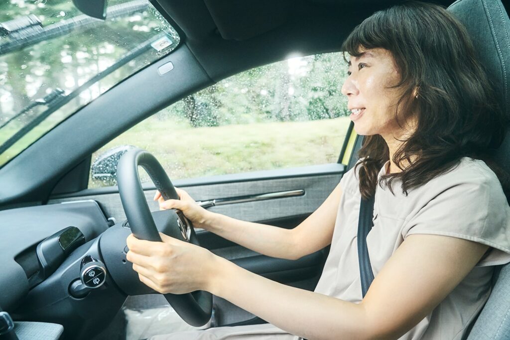 「運転すると肩が凝ってしまうのが悩みだったんです。EX30のワンペダルドライブは、アクセルから足を離すだけで減速から停止までできるので、ブレーキ操作の労力が激減しますね。市街地走行や渋滞でもリラックスして運転することができました」