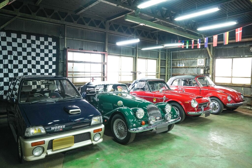 “大人の秘密基地”として横須賀に構える「BACK DROP GARAGE」にはテリーさんが愛するクルマが並ぶ。奥からVWビートルカブリオレ、フェアレディSRL311、モーガン、スズキ・アルトワークス。
